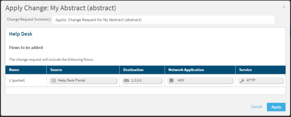 Re-applying changes updates all relevant application flows with changes that have been made to the object since it was rejected in FireFlow. A change request opens in FireFlow to allow any traffic necessary as a result of the changes to the object and remove any traffic that is no longer necessary. Traffic is only removed when it is not necessary for any other applications in AppViz.