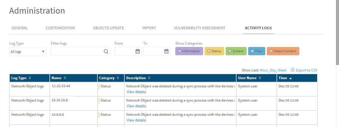 AppViz provides the ability to view all the activities related to applications and network objects in one place, enabling you to see the different impacts of a single action. The extensive options for filtering the logs enable you to search for the activities you want to view. In addition to tracking current applications and network objects, the logs also document the history of deleted objects and decommissioned applications.