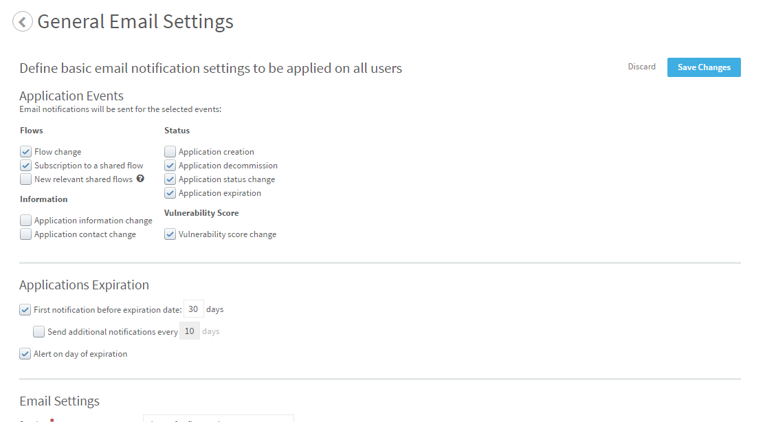 AppViz allows you to define default email notification settings for all users and applications. The general email settings can be overridden by user-specific notification settings. For details, see Customize email notifications.