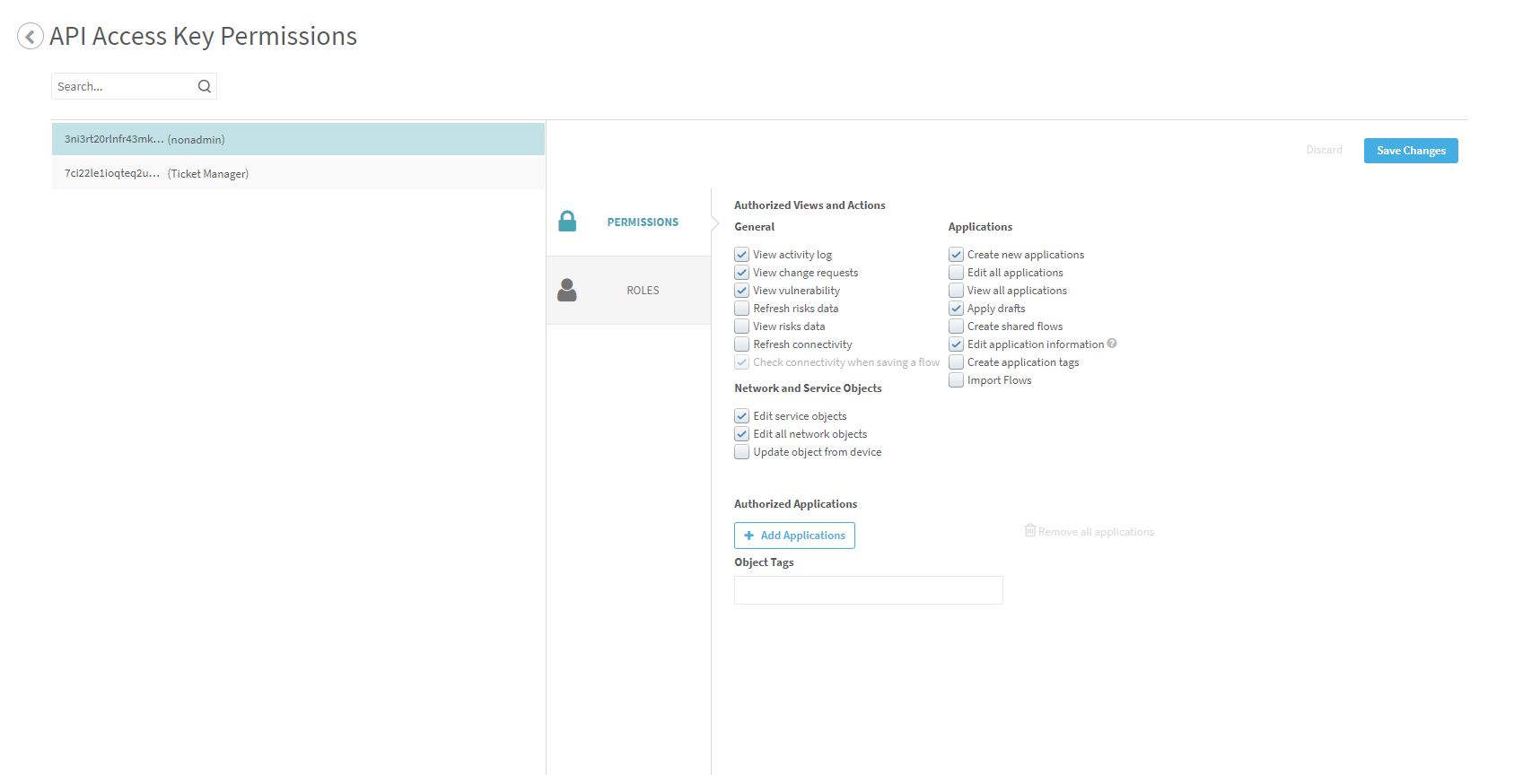 Select this check box to give the the user of the API Access Key permission to view the change requests tab of applications, network objects, and service objects via API. |