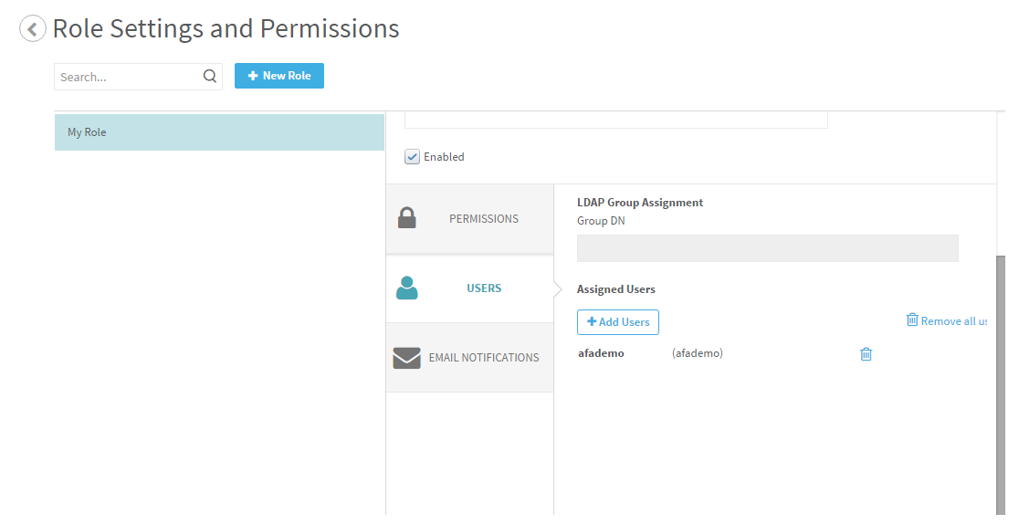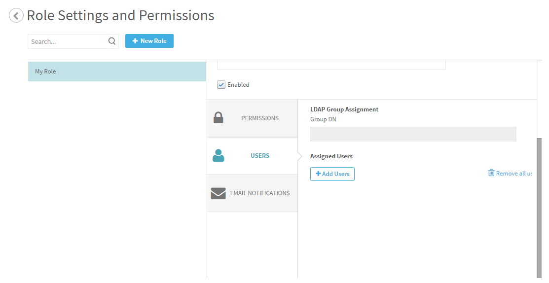 Note: When fetching data from an LDAP server, you cannot manually assign/revoke roles. You must map roles using the LDAP Group DN. For details, see Map LDAP groups to roles .