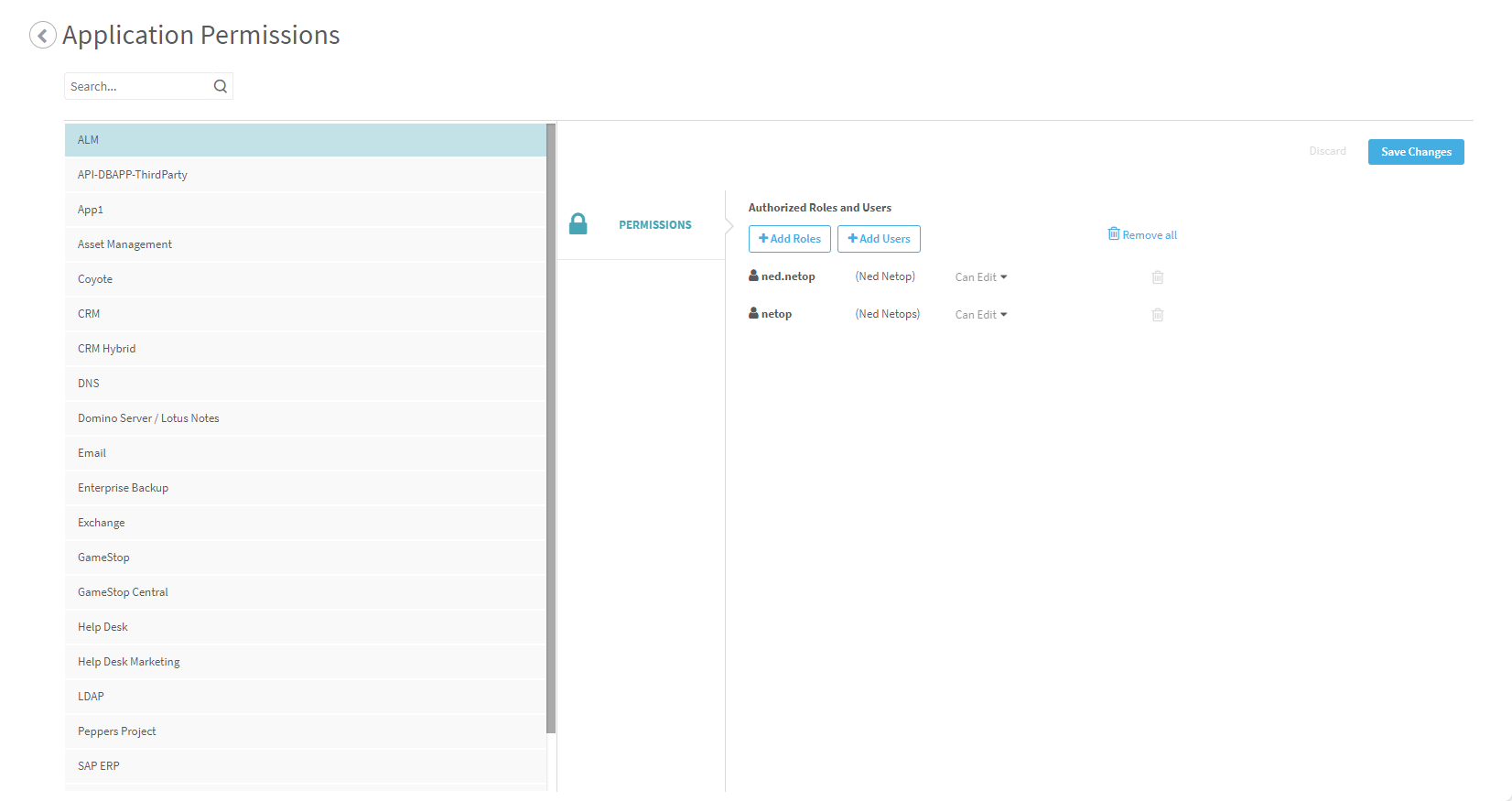 . - To remove all user and role permissions for the application, click Remove all.