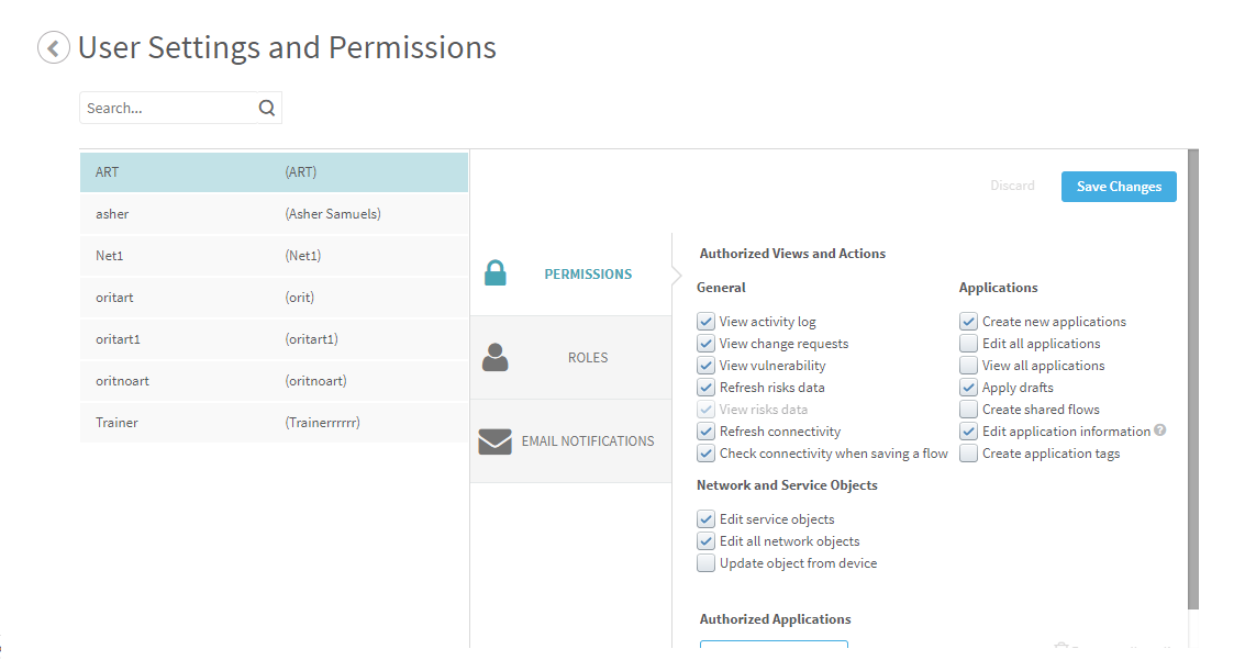 By default, users have access to all Network Objects/Service Objects in application flows. You can use object tags to manage object visibility per user. See Managing Object Permissions Using Tags.