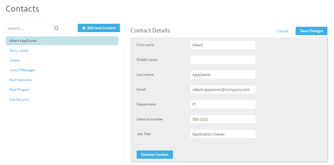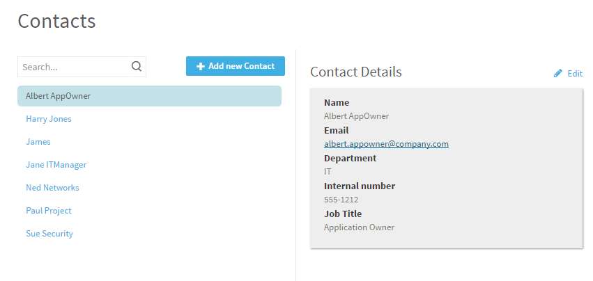 The directory of contacts is used to inform relevant people of application changes. Contacts from the directory are associated with specific applications; each application contact is assigned a specific role. All contact information for an application is displayed in the Contacts area of the application DASHBOARD tab.