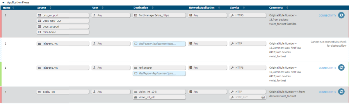 Change requests are not created when you add an abstract object to a flow because the object does not represent a change in the traffic required for the application. If a flow in an application has only an abstract object for either the source or destination field, the flow itself is abstract. It does not represent real traffic, so you cannot run a connectivity check on the flow. These flows are indicated with a pale blue border and striped connectivity indicator.