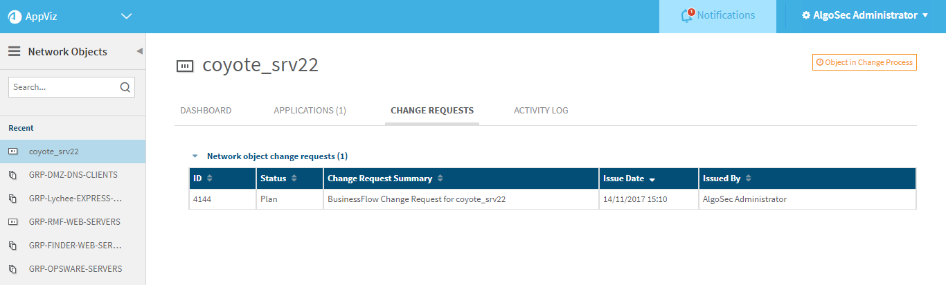 View the application, network object, or service object for which you want to view a relevant change request. For more details, see Business applications, View a network object, or Service objects.