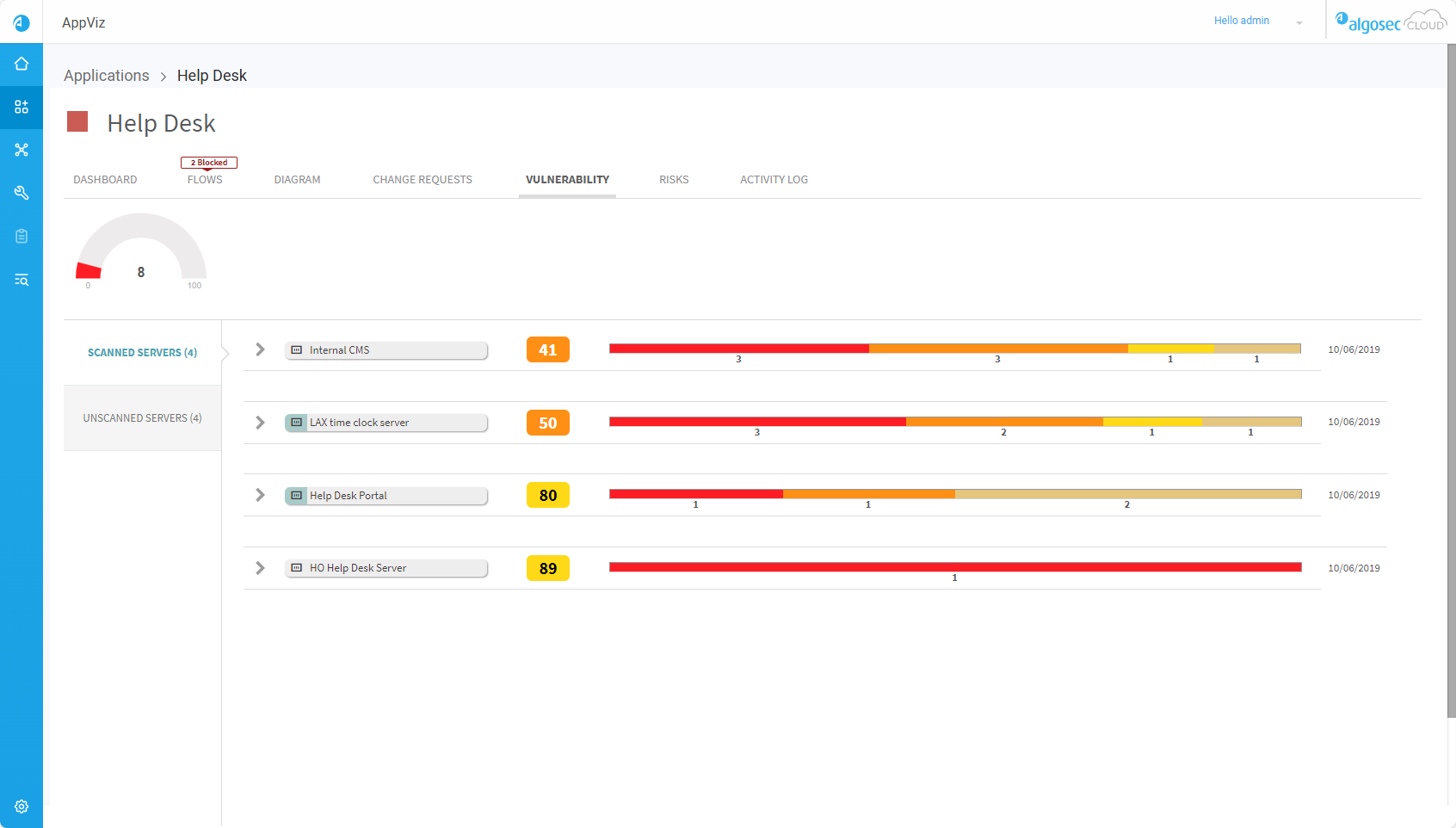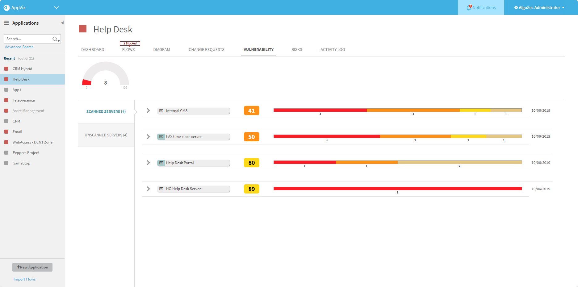 For each server scanned, AppViz shows the relevant network object, vulnerability score, summary color strip, and the date of the last scan. For network objects that represent multiple IP addresses, the vulnerabilities for all relevant IP addresses are included.