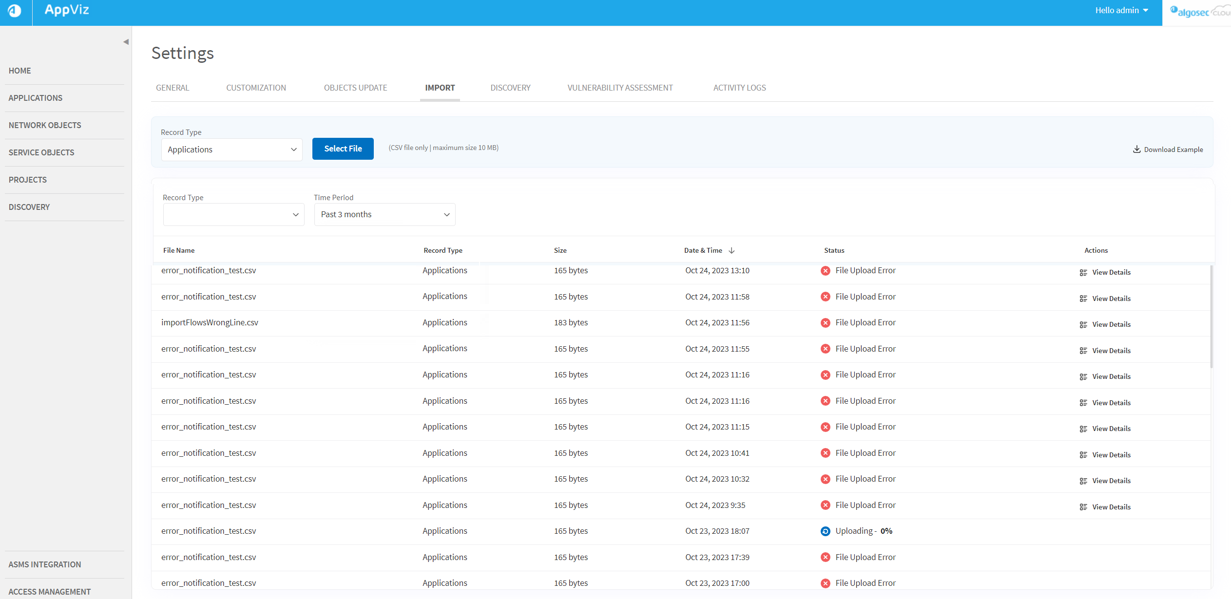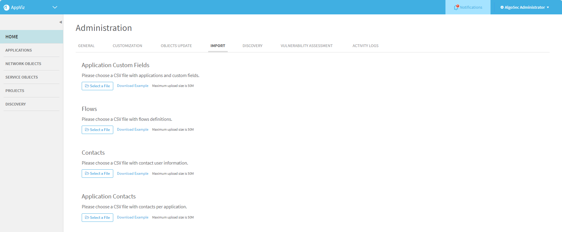 Note: You can download an example of any of the types of CSV files. In the Import tab of the Administration area you can download examples of the Applications, Contacts, Flows or Application Contacts CSV file. In the Objects Update tab of the Administration area you can download an example Network Object CSV file.