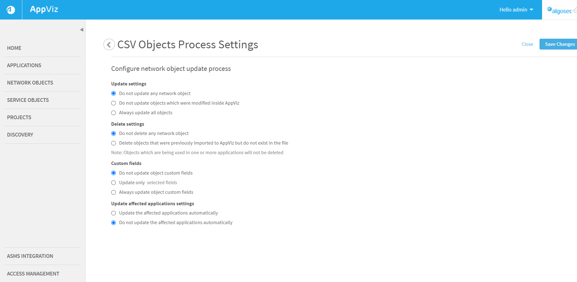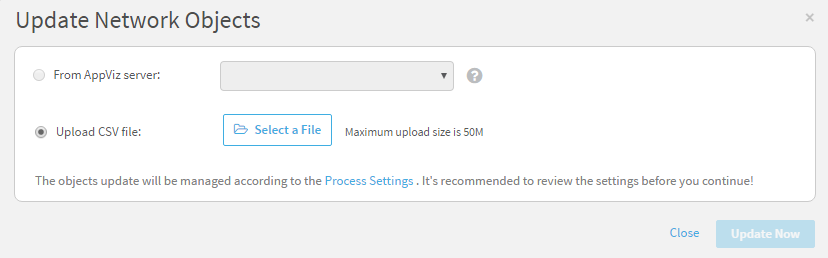 Note: You can optionally import network objects using the CLI. For details, see Import CSV data into AppViz via CLI.