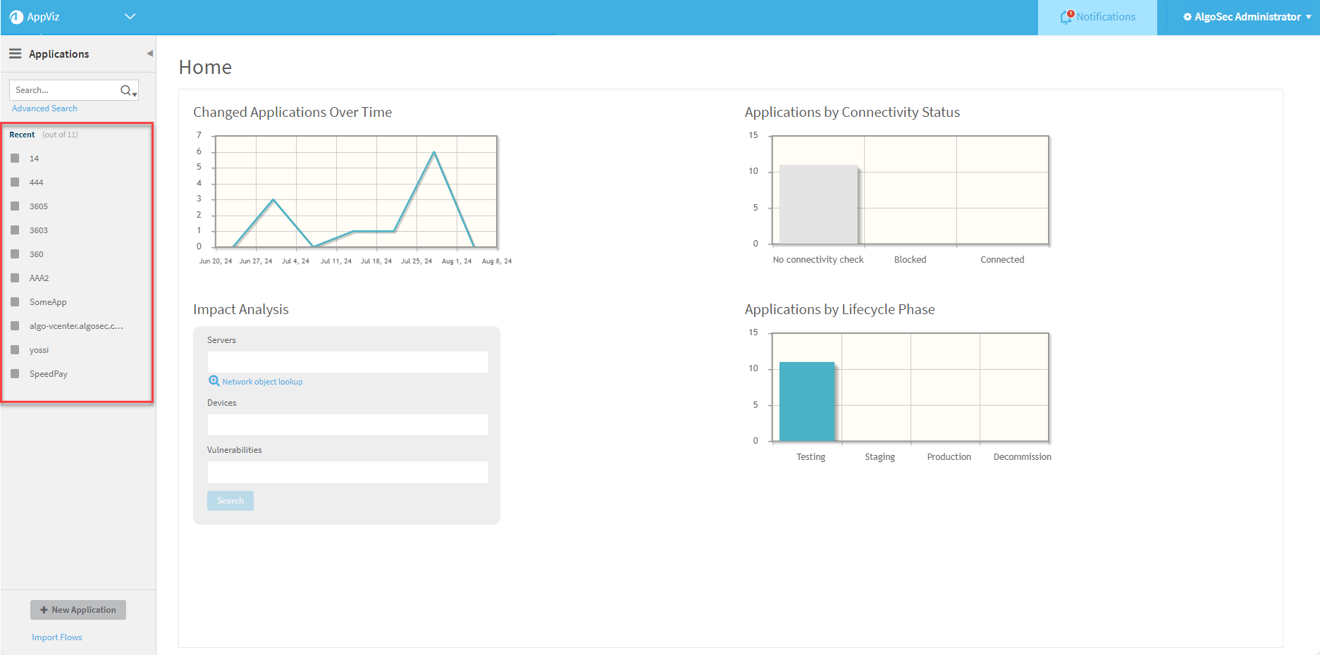After clicking APPLICATIONS in the AppViz main menu, the list of applications appears on the left. Click an application name to view its details in the workspace and manage application workflow.