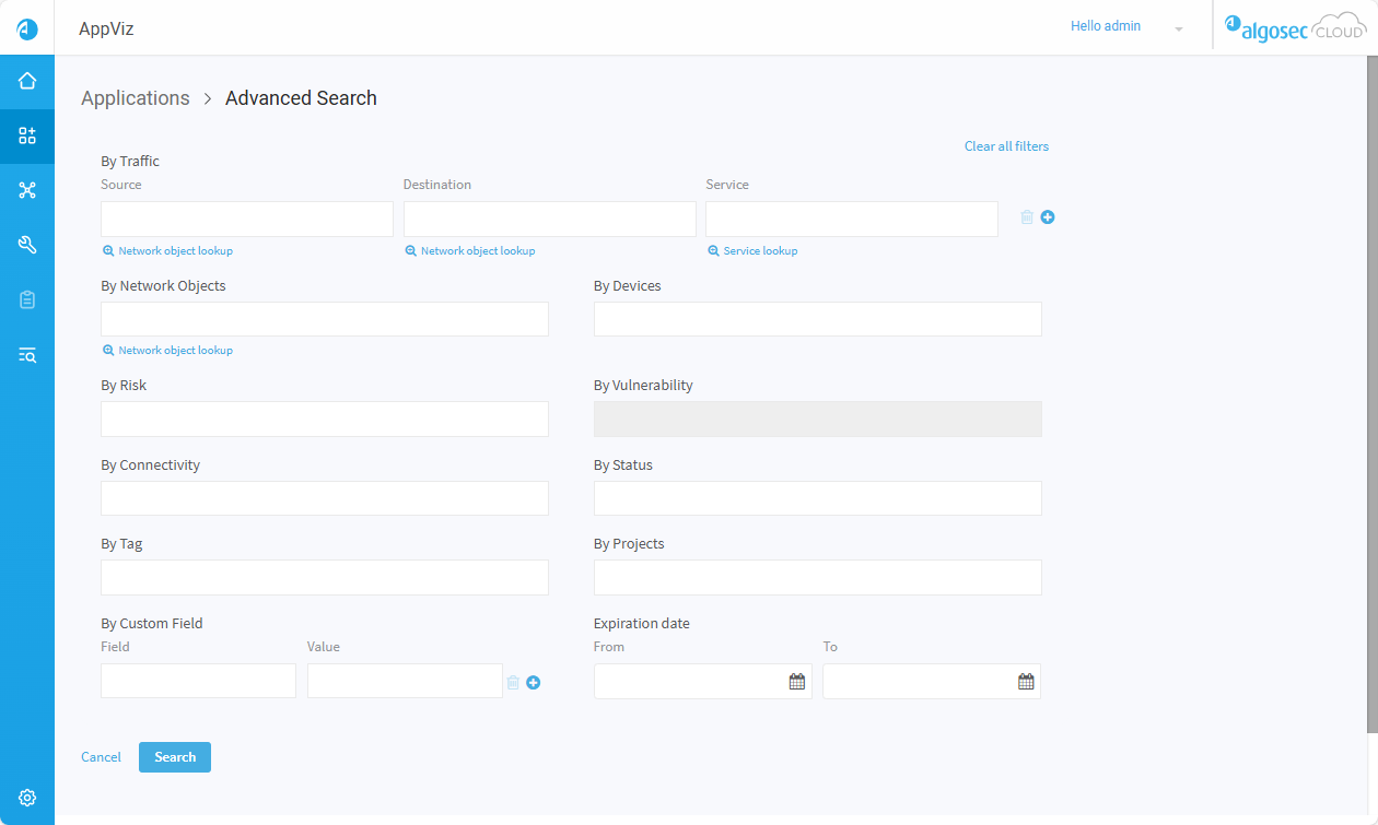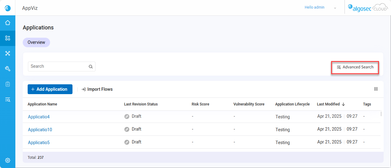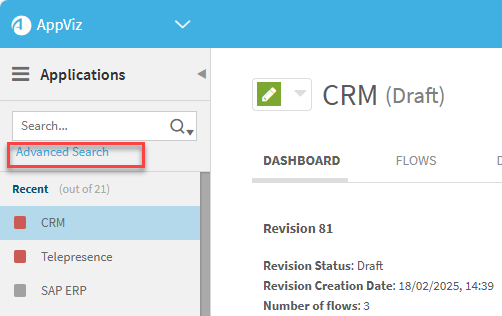 At the top left of the AppViz Applications area, enter text in the search bar at the top left to search for application names or tags.