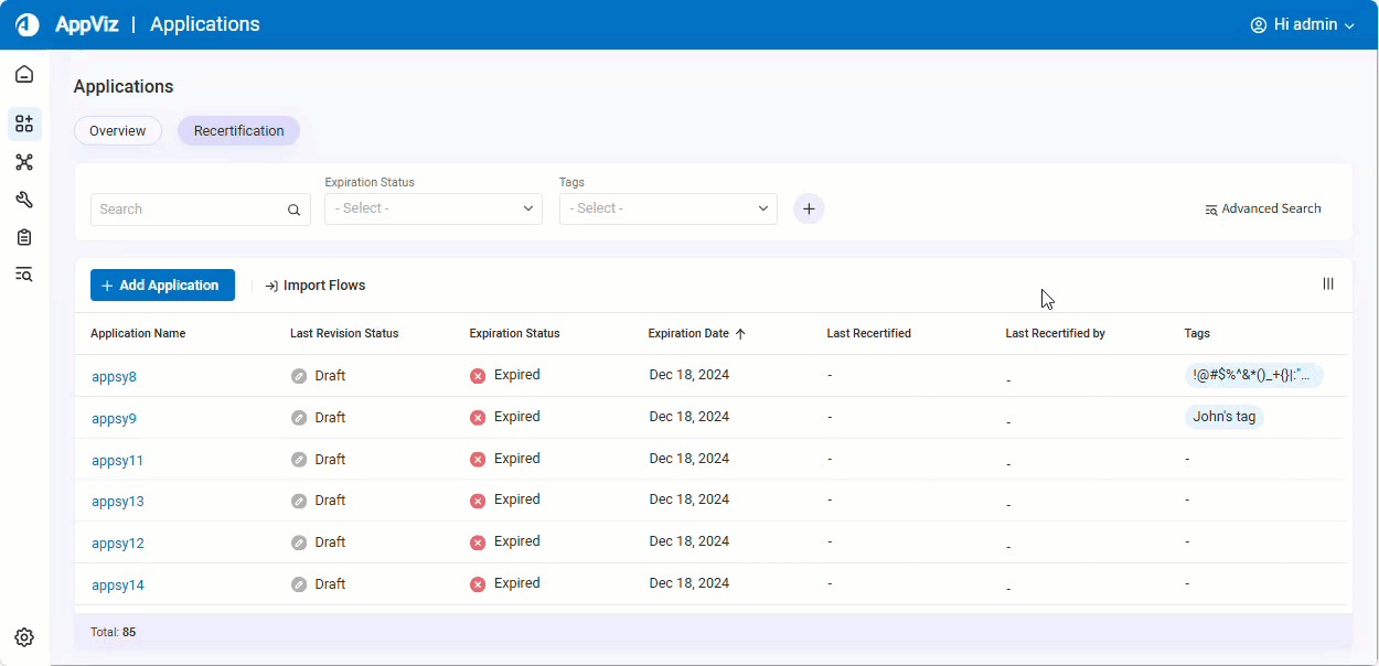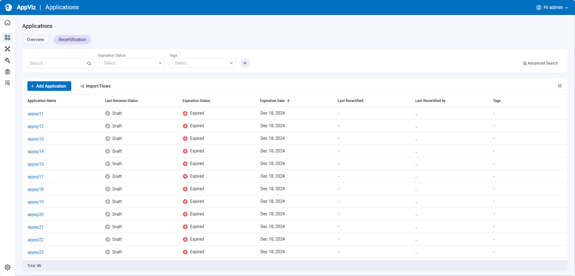 The Recertification tab lists the applications added to AppViz with the details most relevant to understanding the application recertification status.