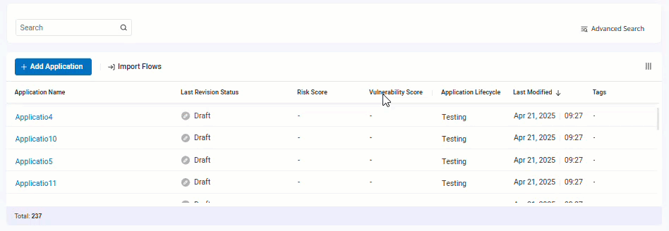 To sort by Application Name, Total Flows, or Last Modified date, click on its column name.