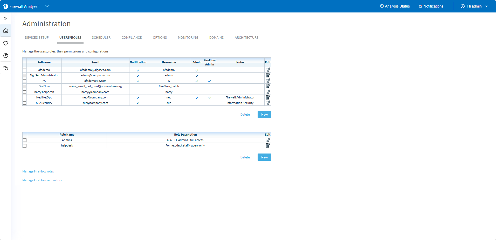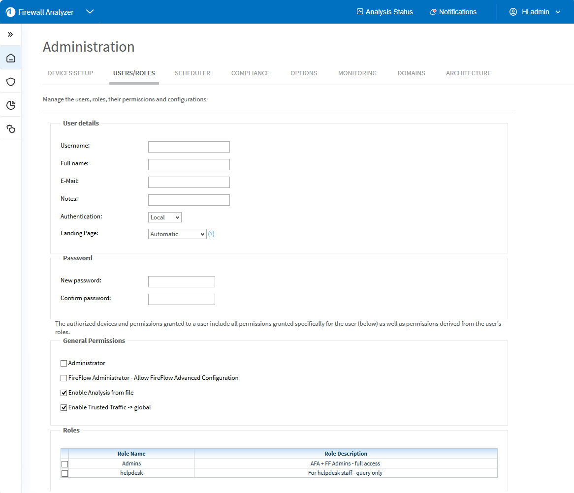 After logging into the AlgoSec Security Management Suite Firewall Analyzer or FireFlow will appear. See below for the default landing page for each user. For administrators, privileged users, and roles, you can override the default behavior by defining a landing page per user/role. For unprivileged users (requestors), you can override the default behavior by defining a landing page for all unprivileged users.