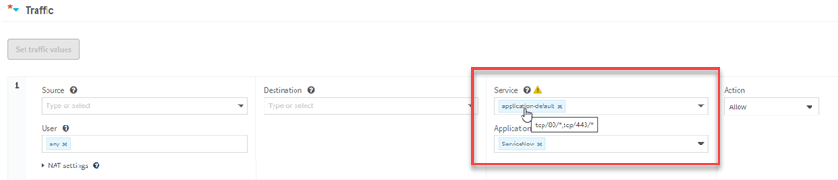 By default, ASMS assigns service (ports and protocols) to each application. This default service appears as the value application-default in the Service field. The default service may vary depending on the application in question