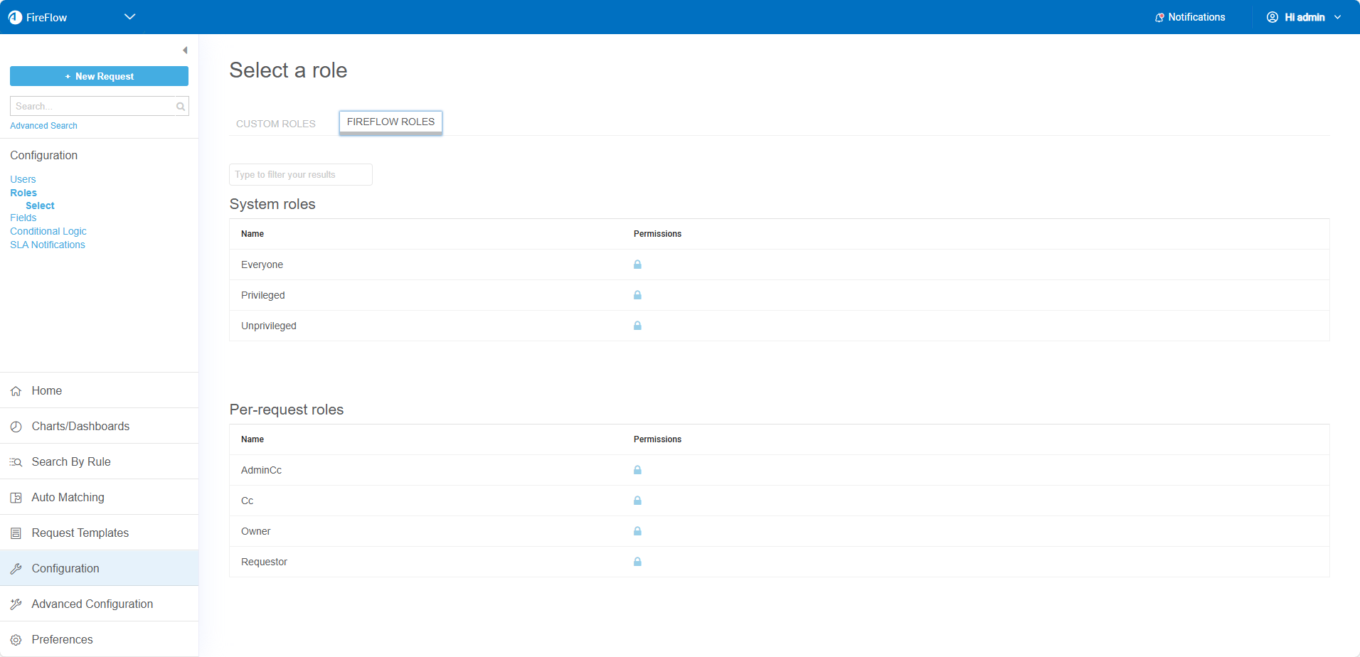 Log in to FireFlow for configuration purposes. For details, see Log in for configuration purposes.