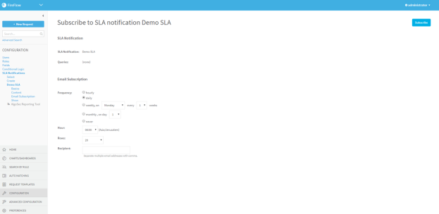 By default, when you create an SLA notification, you are automatically subscribed to it, and emails containing the SLA notification's content will be sent to the email address associated with your account. If desired, you can configure FireFlow to send these emails to other recipients, and/or change the frequency and time at which these emails are sent.