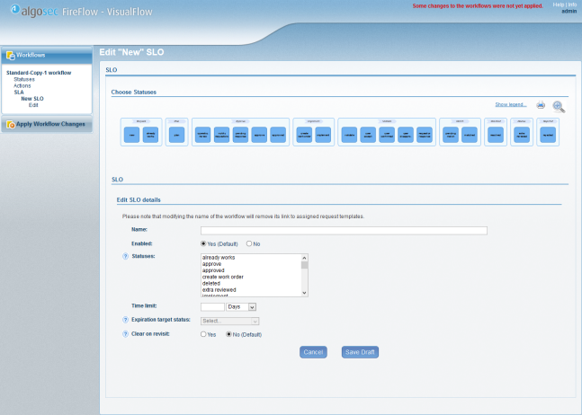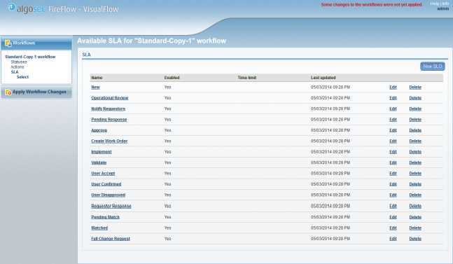 FireFlow enables you to configure a Service Level Agreement (SLA) per workflow. An SLA is a formal definition of the logical workflow stages that comprise a change request's lifecycle and, optionally, the amount of time allotted for completing each of these stages and the change request lifecycle as a whole. Hence, a separate SLA must be defined for each workflow.