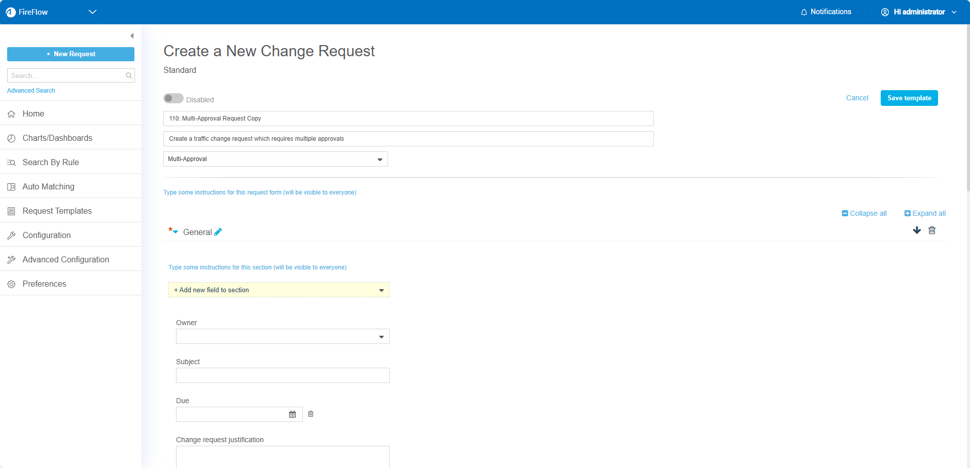 Check this box to enable the template. Disabled templates will not appear as an option in the create a new change request page.