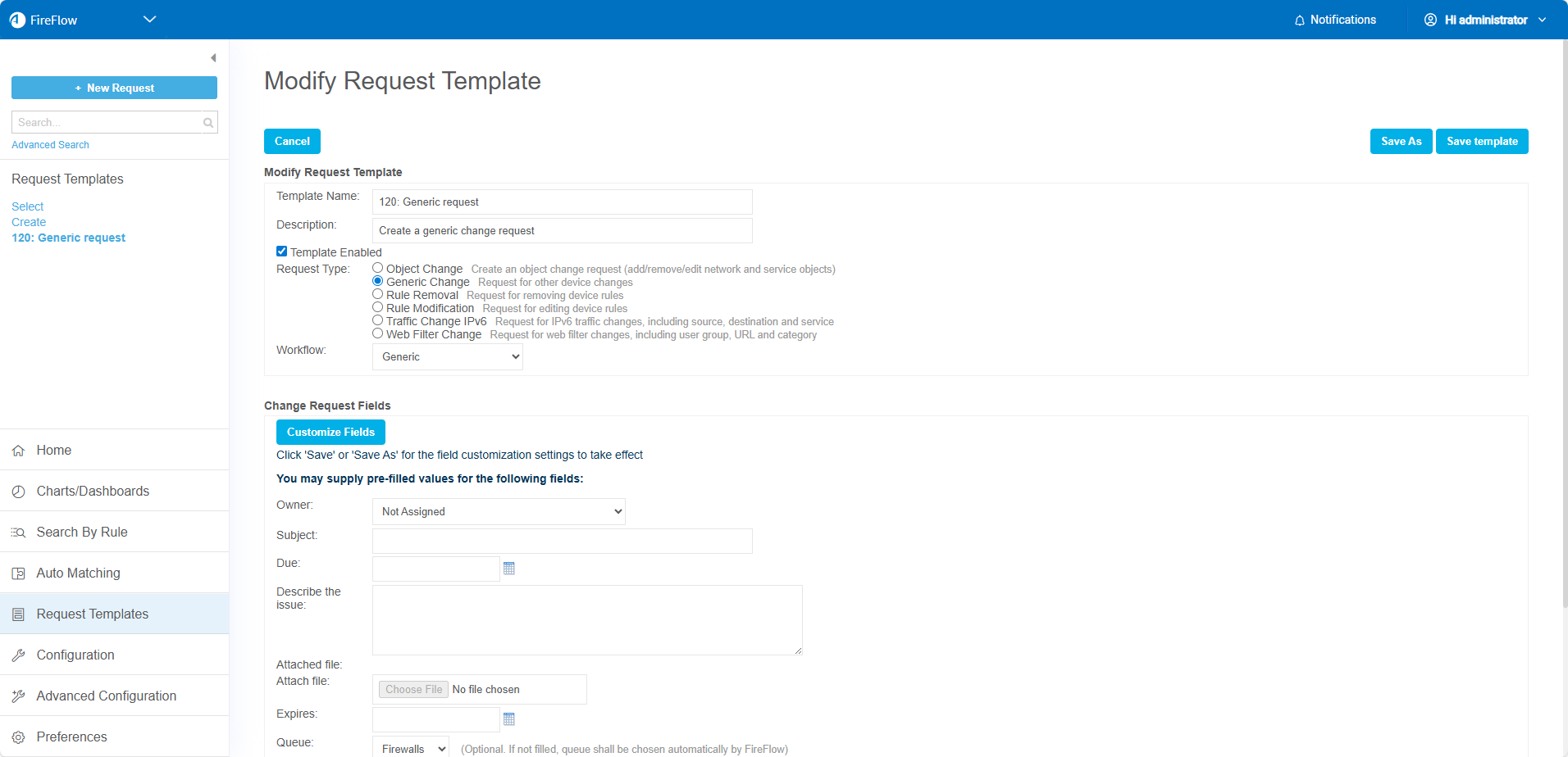 This topic describes how to add new request templates to FireFlow, from scratch or based on an existing template, as well as how to edit existing templates.