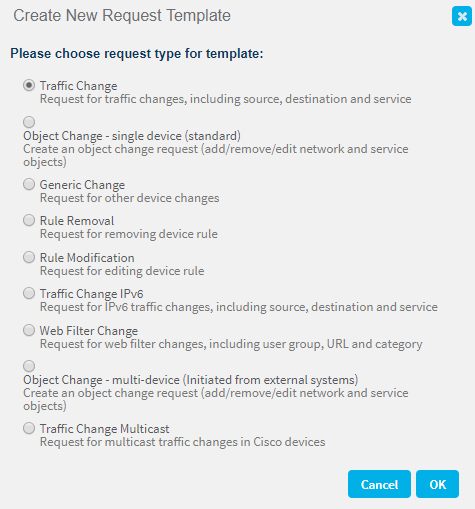 This procedure describes how to add a new IPv4 traffic, multicast or multiple-device object change request template from scratch.