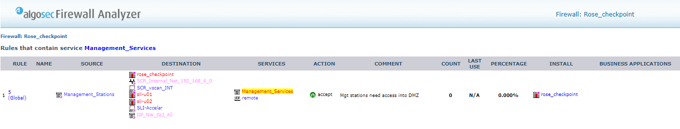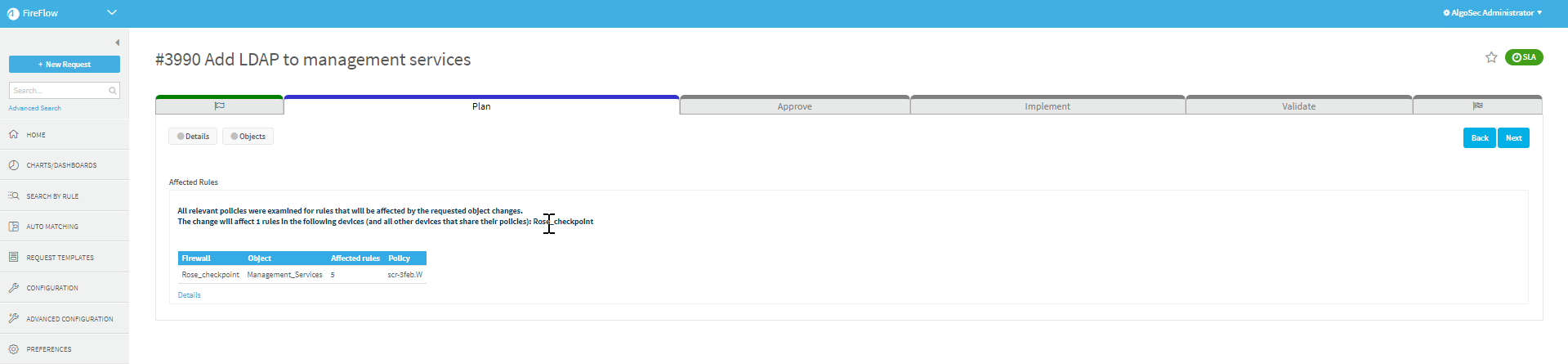 Note: For Check Point devices, FireFlow finds affected rules on all devices where the object exists. Specifically, object change requests for objects defined on the CMA show affected rules on all policies of devices below that CMA, and object change requests for objects defined on the MDSM show affected rules on all policies of devices below any of the CMAs.