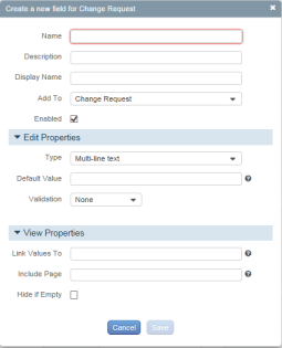 Either the field appears at the bottom of the screen, or the Create a new field for Change Request dialog is displayed.