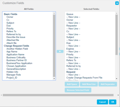 1. In the Change Requests Fields area, click Customize Fields.
