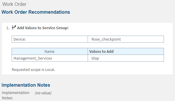 - The network operations user implements the requested changes on the security device according to the work order, by using the relevant management system (for example, Check Point Dashboard or Juniper NSM) to implement the changes.