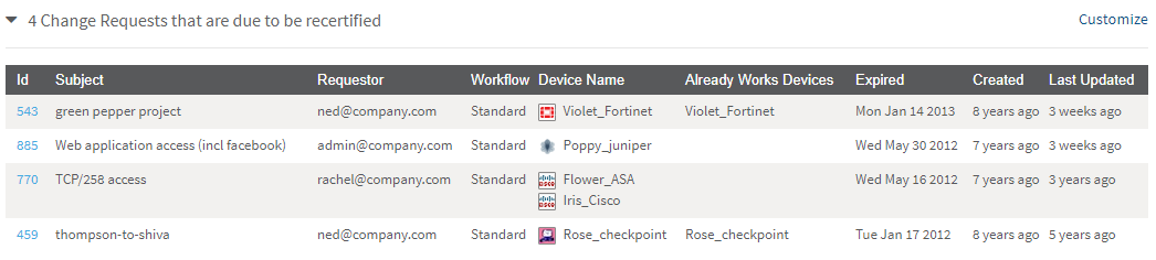 The network operations user views a list of change requests that are due to be recertified.