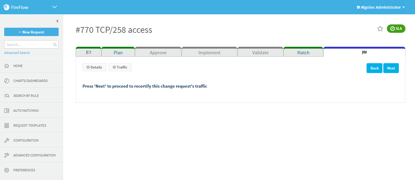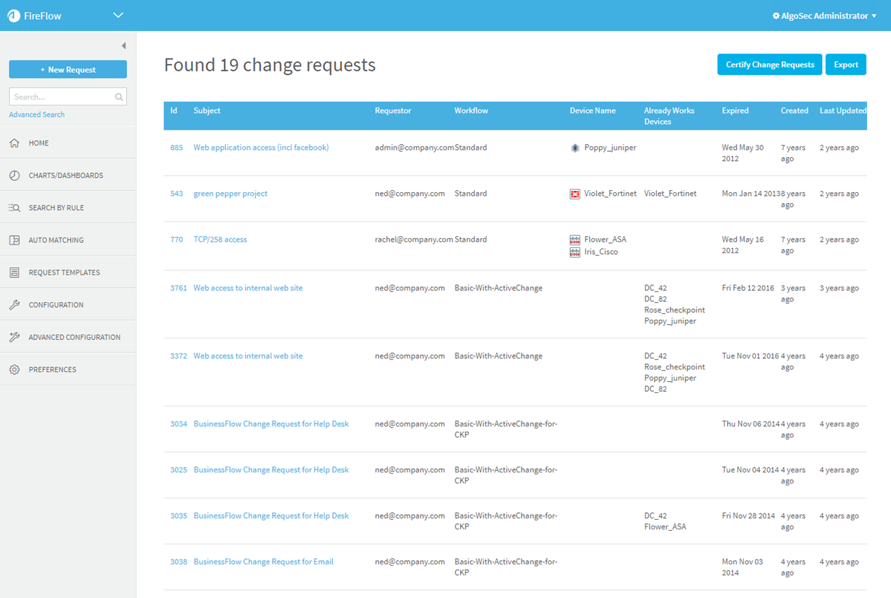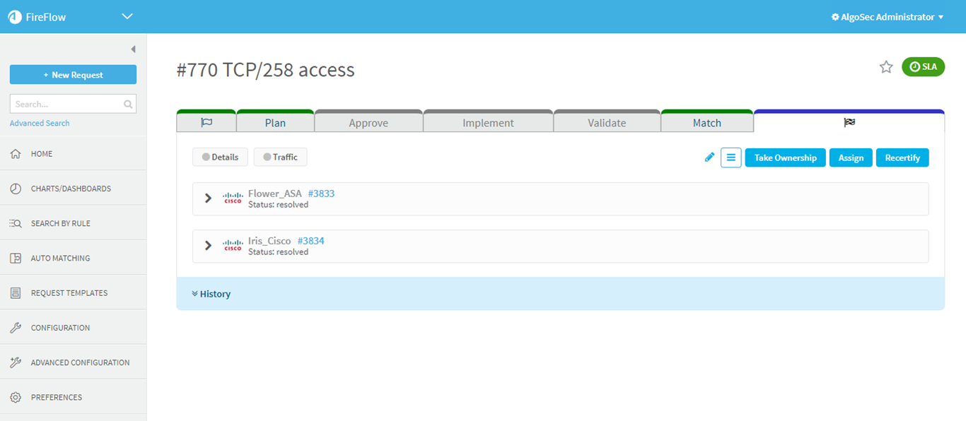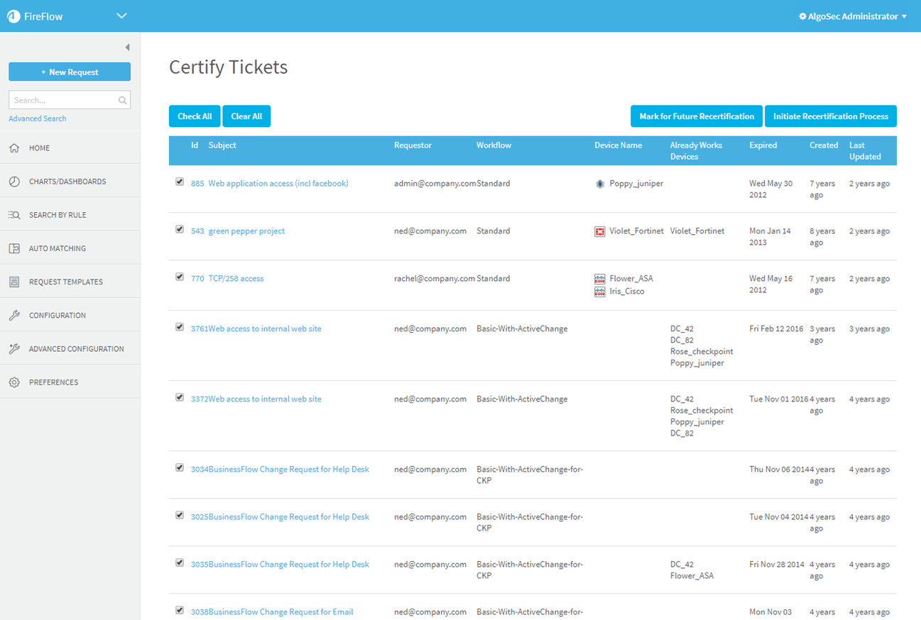 For example, if you have a traffic change request that has since expired but did require the addition of Allow traffic to a specific device policy, re-certify the change request to verify whether that change is still required.