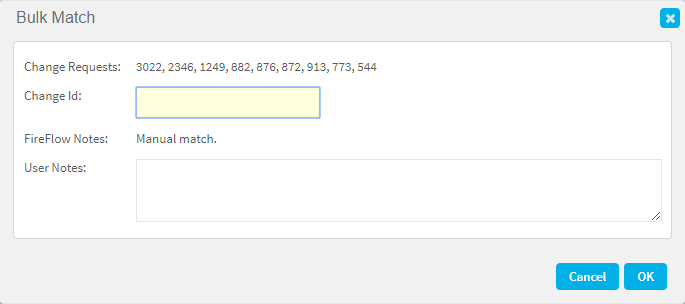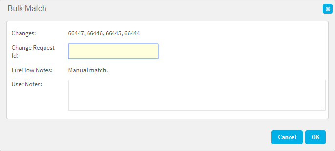 The changes are matched with the change request. In the Bulk Match page, the change request will now appear in the Matched list's Manual Match, Last X Days sub-list.