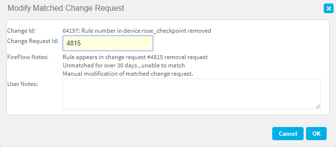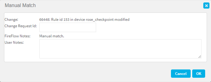 This topic describes how to manually match a change request to device changes, when FireFlow was unable to do so automatically.