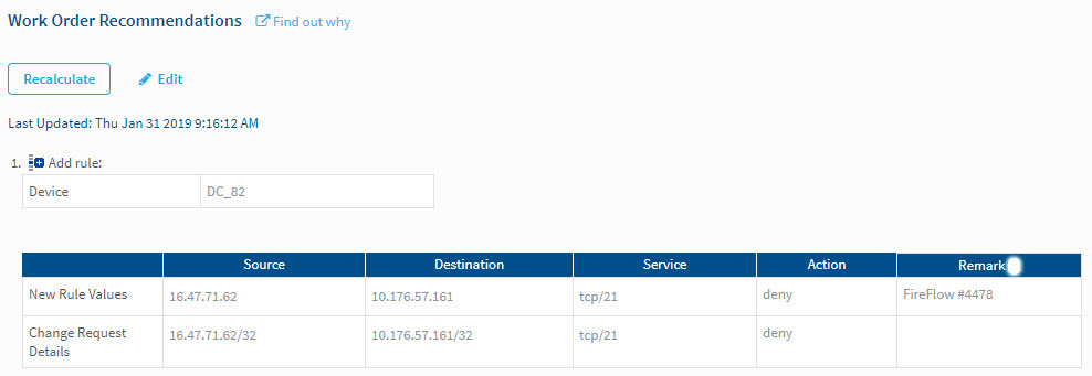 2. FireFlow creates a work order and displays a list of recommendations for implementing the requested change.