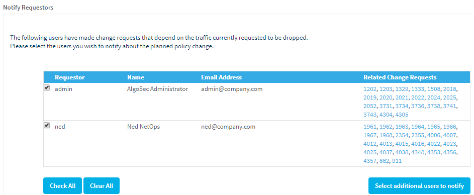 3. The network operations user then specifies which of the related change requestors (and optionally other users) should receive a notification that the traffic will be blocked.