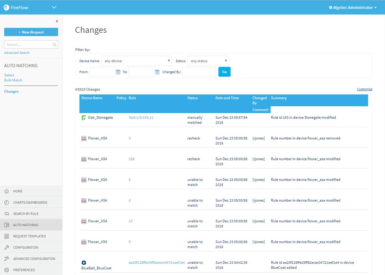 The rule changes are filtered according to the criteria you specified.
