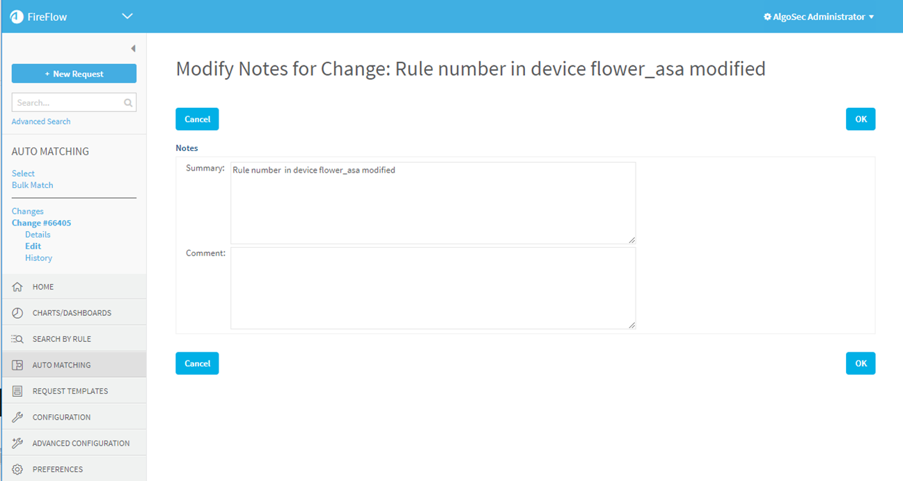Details about the change request and match record associated with this change.