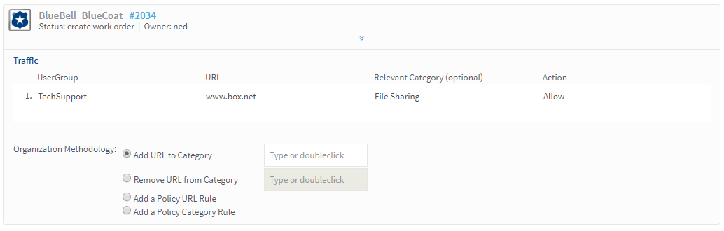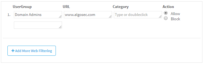 The request includes information about the relevant user group, URL, category, and action for the Web filtering rule. For example, the requestor may submit the following request: