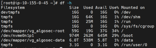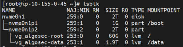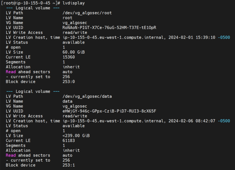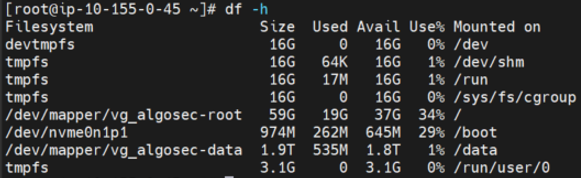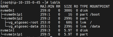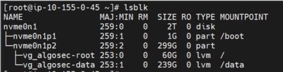 The AlgoSec AMI comes with 239 GB in the data partition. After you deploy it in a AWS environment, according to your sizing, you may need to increase the disk space of your newly deployed AWS instance.