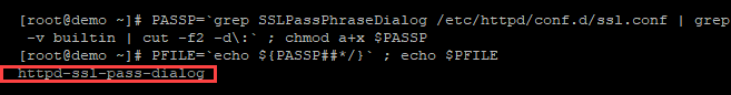 PASSP=`grep SSLPassPhraseDialog /etc/httpd/conf.d/ssl.conf | grep -v builtin | cut -f2 -d\:` ; chmod a+x $PASSP
