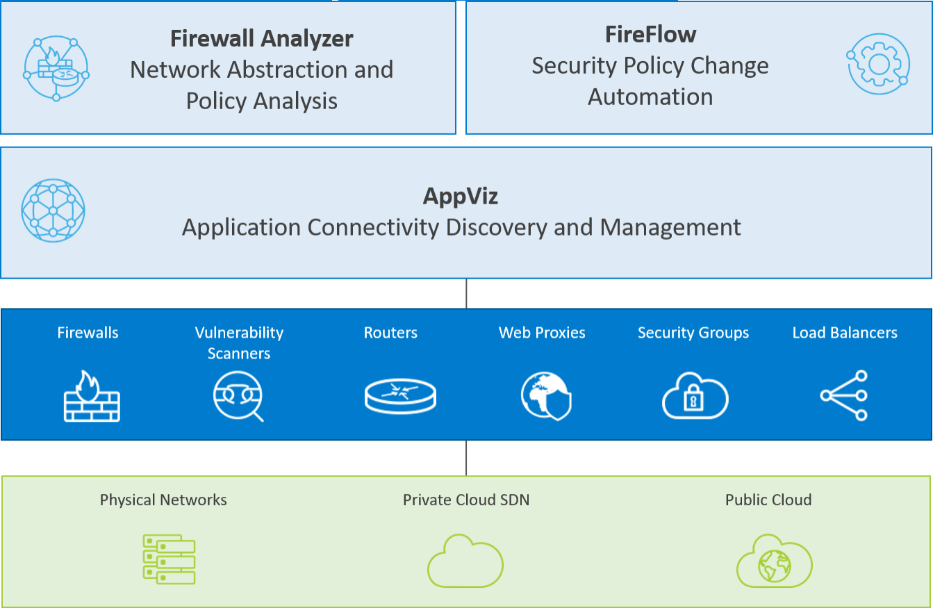 AppViz allows applications owners to view network connectivity based on business needs, and automatically computes and required changes to firewalls and routers. AppViz is available to customers who are already using FireFlow and triggers the relevant FireFlow change requests.