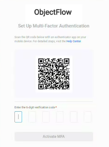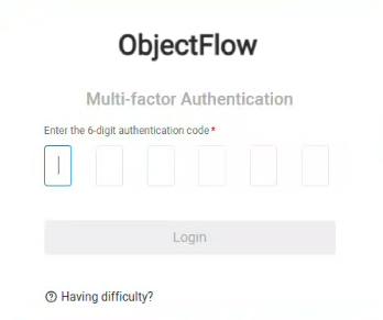 If this is your first time logging in with Multi-Factor Authentication (MFA), the interface will guide you to set up your MFA device and login using MFA for ObjectFlow.