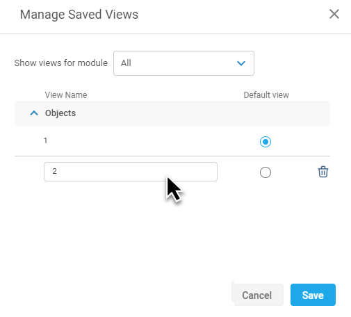Click Manage Views to open the Manage Saved Views dialog: