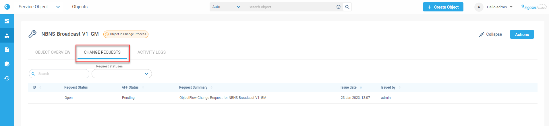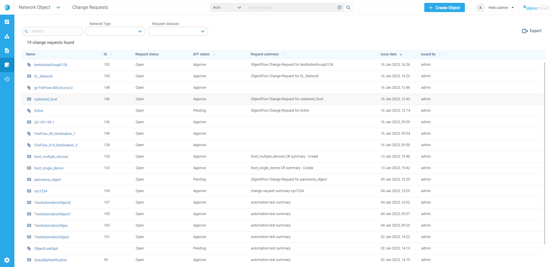 Select object type: Network object or Service object. The list of Change requests, showing all objects with active FireFlow Change Requests appears for the object type selected.
